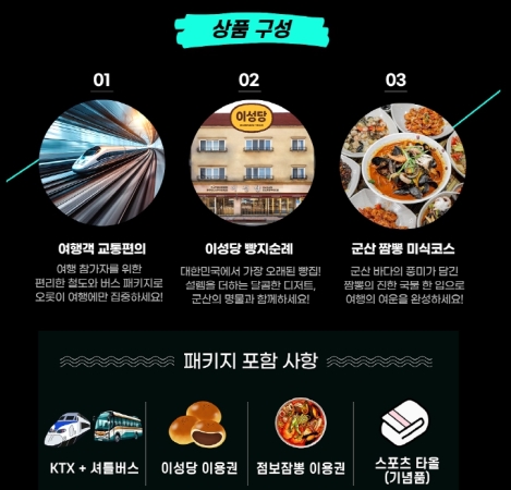 **[ALL IN GUNSAN]**»óǰÀº KORAIL°ú ±º»ê½Ã°¡ Çù·ÂÇØ ¿î¿µÇÏ´Â ¿©Çà »óǰÀ¸·Î, ±º»ê»õ¸¸±Ý¸¶¶óÅæ Âü°¡(º°µµ ¿¹¾à)¿Í ÇÔ²² °ü±¤°ú ¹Ì½Ä ¿©ÇàÀ» µ¿½Ã¿¡ Áñ±æ ¼ö ÀÖ´Â ÇÁ·Î±×·¥ÀÔ´Ï´Ù.
